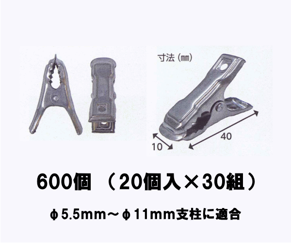 商 品 説 明 材質 ステンレス サイズ (約)長さ40mm×幅10mm 適合支柱サイズ φ5.5〜φ11mm 入数 600個 (20個入×30組) カラー シルバー 特長 ●ステンレスだからサビに強く耐久性に優れています。